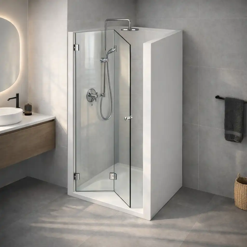 Die Eckdusche ist der Klassiker im deutschen Badezimmer — aus gutem Grund. Sie nutzt den ohnehin vorhandenen Platz in der Ecke, statt wertvolle Fläche im Raum zu verschwenden. Zwei bestehende Wände, zwei Glaselemente — fertig ist eine Dusche, die selbst kleine Bäder großzügig wirken lässt.