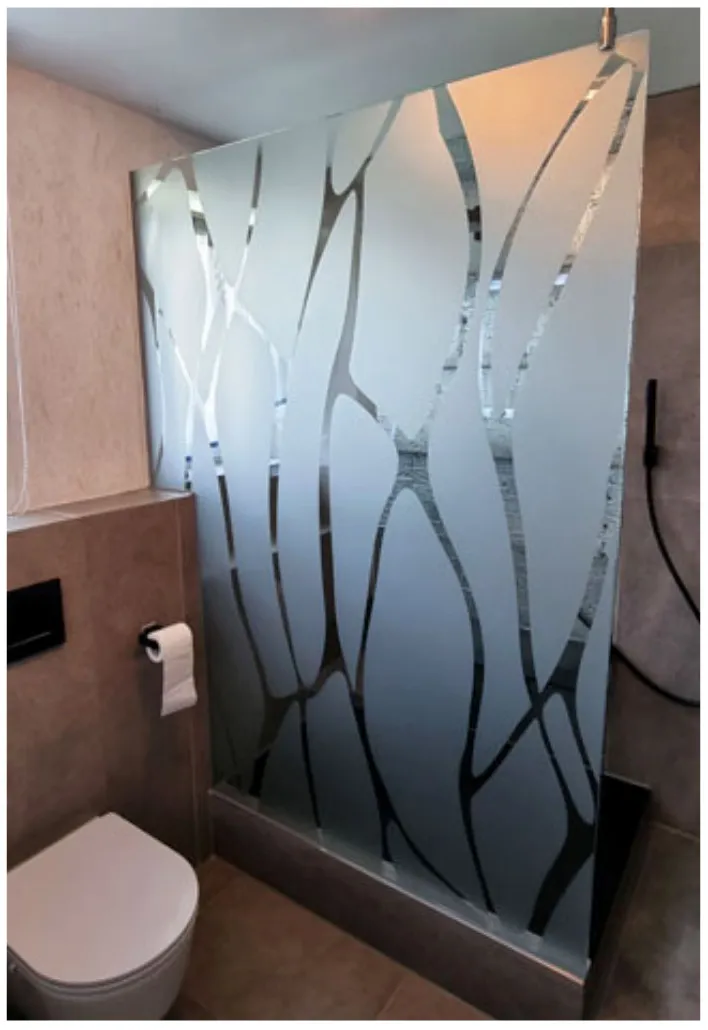 Neben schwarzen Sprossen gibt es weitere Möglichkeiten: Satiniertes Glas — vollflächig oder als Sichtschutzstreifen in Körperhöhe — bietet Privatsphäre bei moderner Optik. Folien mit Motiven oder Mustern lassen sich direkt auf das Glas aufbringen. Farbiges Glas in Grau- oder Bronzetönung setzt einen dezenten Akzent.