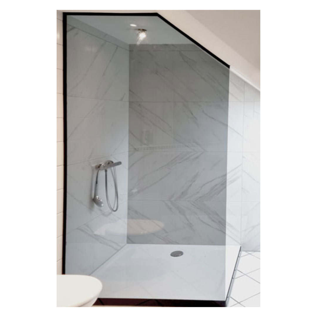 Eine freistehende Glasscheibe aus 8 mm oder 10 mm ESG — ohne Tür, ohne Rahmen, ohne Schwelle. Das Ergebnis: maximales Raumgefühl und die einfachste Reinigung aller Duschtypen. Individuell nach Maß für fast jedes Bad.