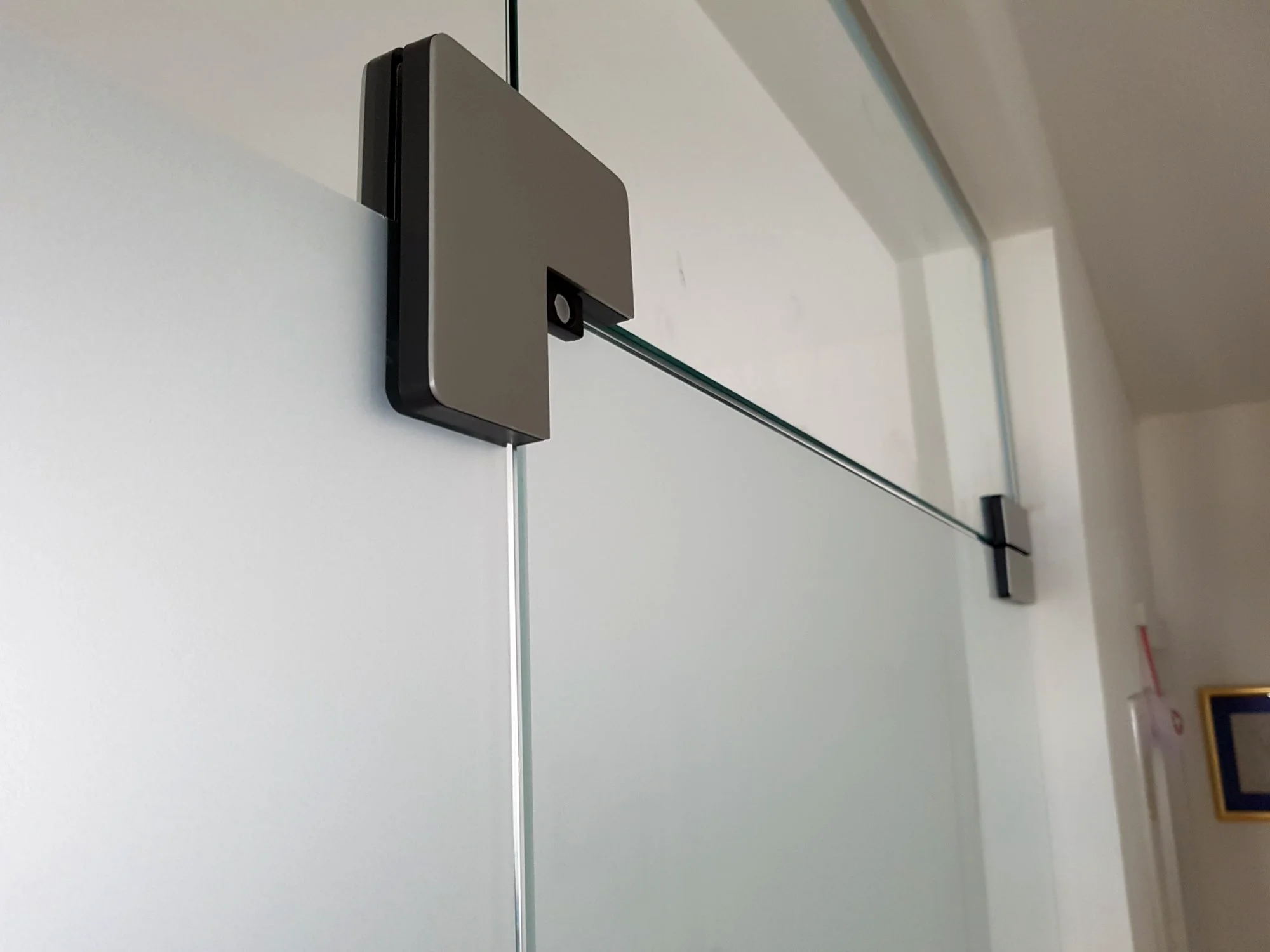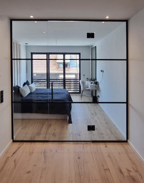 Offene Büros brauchen Rückzugsräume — aber keine Betonwände. Eine Glastrennwand trennt Besprechungsraum oder Einzelbüro vom Rest, ohne Licht oder Fläche zu nehmen. Mit Sichtschutzfolie, mit oder ohne Tür, in Edelstahl, EV1 oder Schwarz matt.