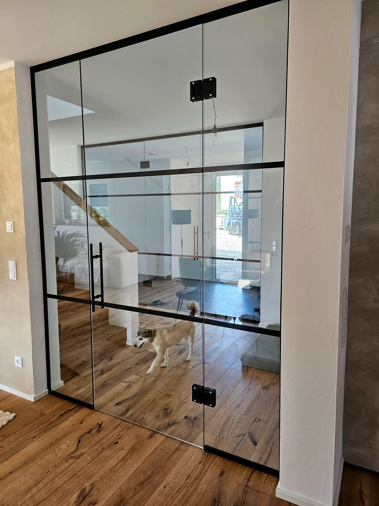 Für ein Steuerbüro in Augsburg-Lechhausen haben wir gemeinsam mit Room and Design die bestehende Verglasung durch eine neue Raumaufteilung ersetzt — drei Trennwände, drei Drehtüren in EV1, Empfang und Besprechung klar getrennt.