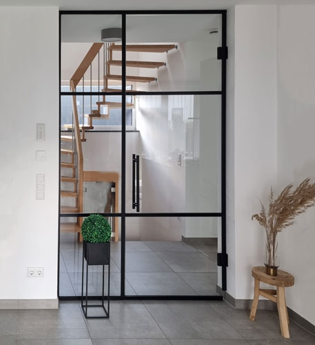 Glastür im modernen Industrie-Look für Wohn- und Büro. Mit schwarzen Beschlägen und klaren Linien...
