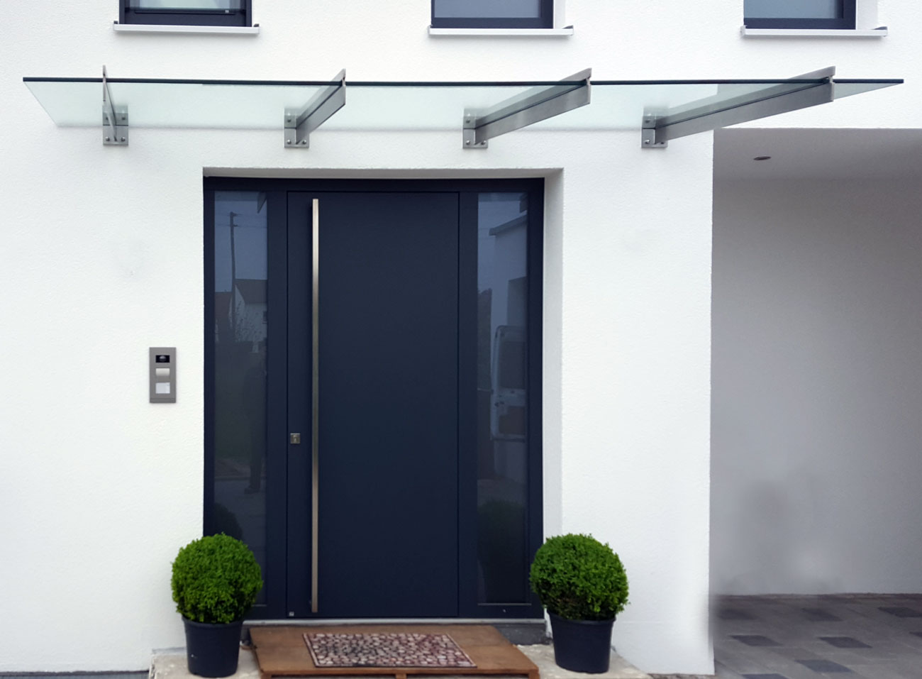 Ein Glasvordach mit Seitenteil bietet zusätzlichen Schutz vor seitlichem Wind und Regen...